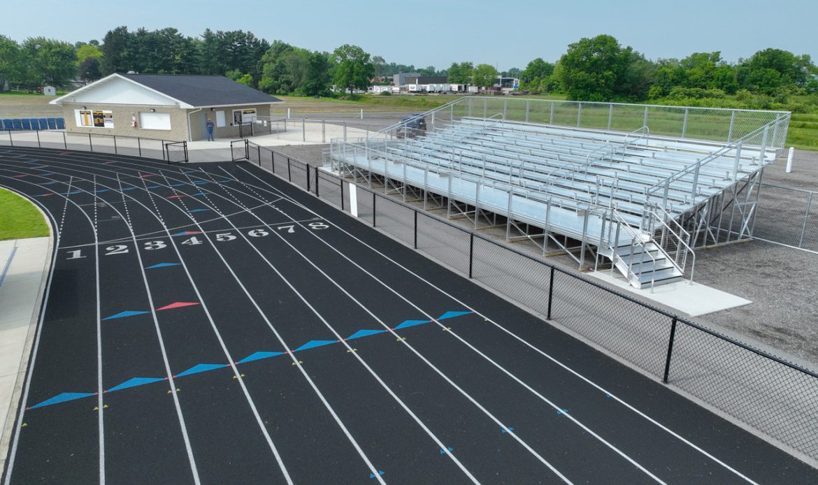 Monroeville High School recently constructed a new track and needed seating before their next season began. Utilizing the available area, Sightlines Athletic Facilities designed the perfect fit for the finish line seating. The DLWE 10 row x 60’6″ long bleacher seats approximately 315 people with ADA sections along the front walkway. We have also completed the football field grandstand just up the road at Marsh Field.